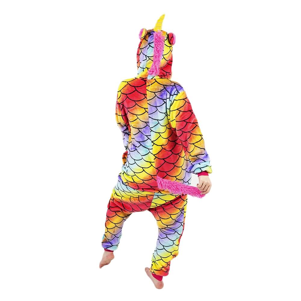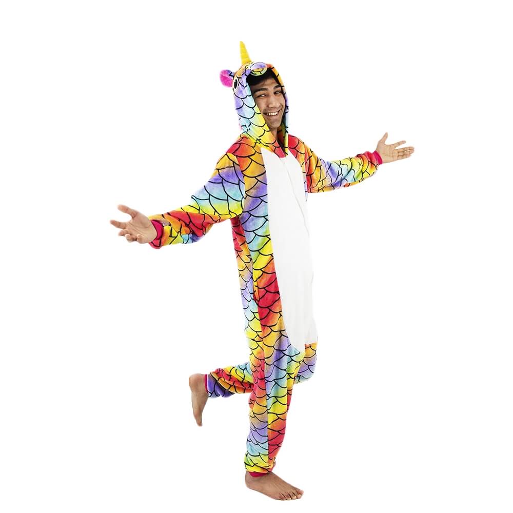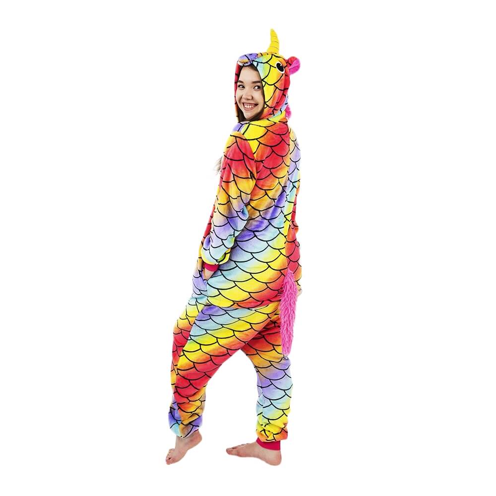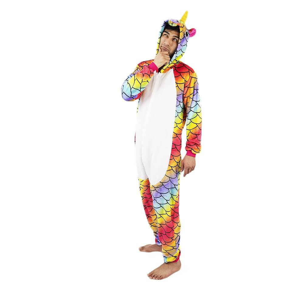 Кигуруми Единорог Хамелеон отличается ярким дизайном и красочной расцветкой. Он сшит из мягкой, с небольшим ворсом ткани, которая практически не мнется. Принт имитирует чешую. Креативное оформление подчеркивается объемным декором: хвостиком сзади, большим рогом и ушками на капюшоне, пушистой розовой гривой. На животе есть белая вставка.