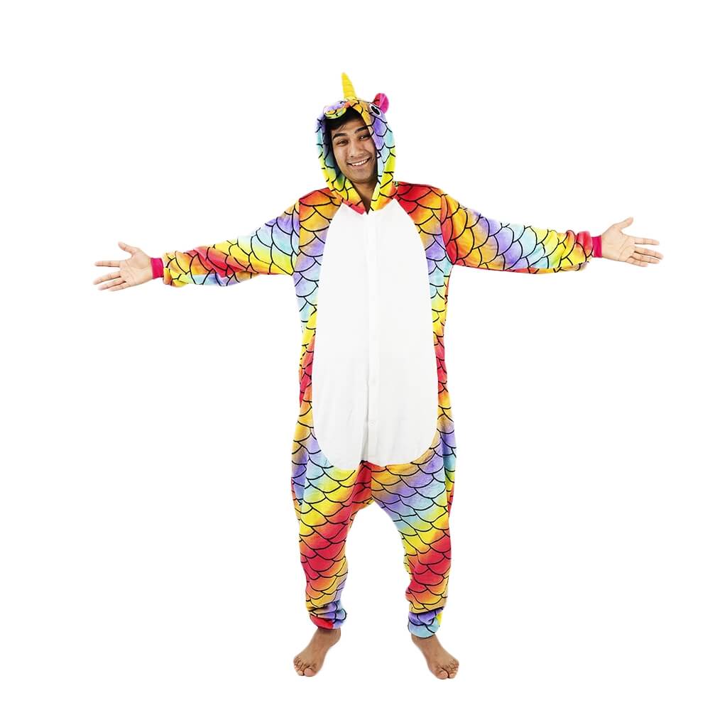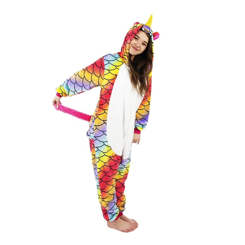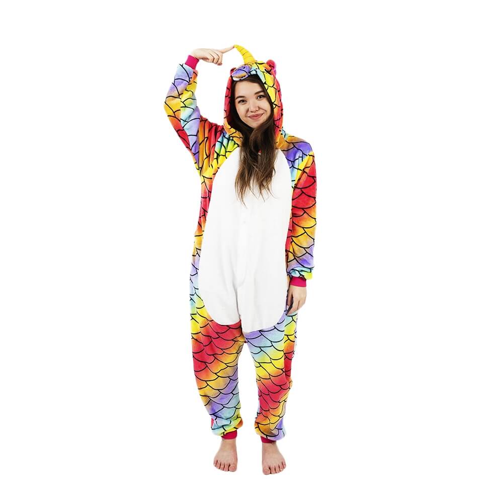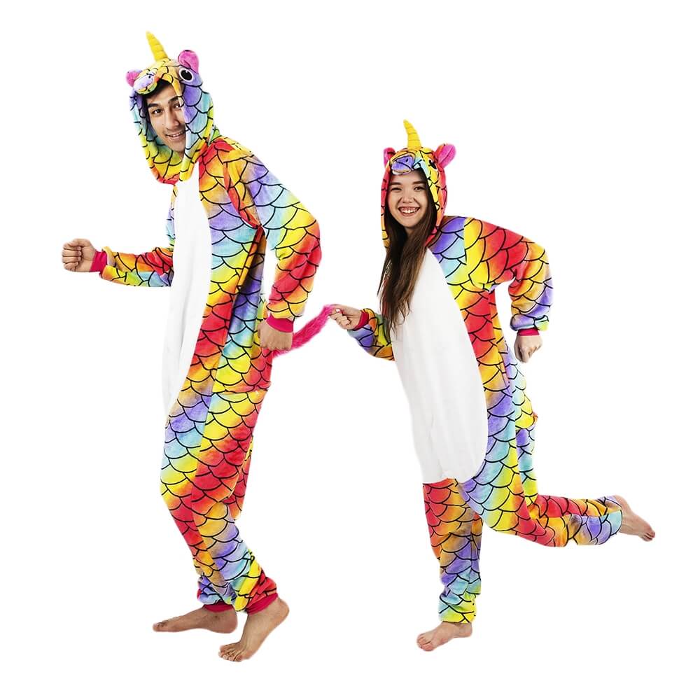 Кигуруми Единорог Хамелеон отличается ярким дизайном и красочной расцветкой. Он сшит из мягкой, с небольшим ворсом ткани, которая практически не мнется. Принт имитирует чешую. Креативное оформление подчеркивается объемным декором: хвостиком сзади, большим рогом и ушками на капюшоне, пушистой розовой гривой. На животе есть белая вставка.