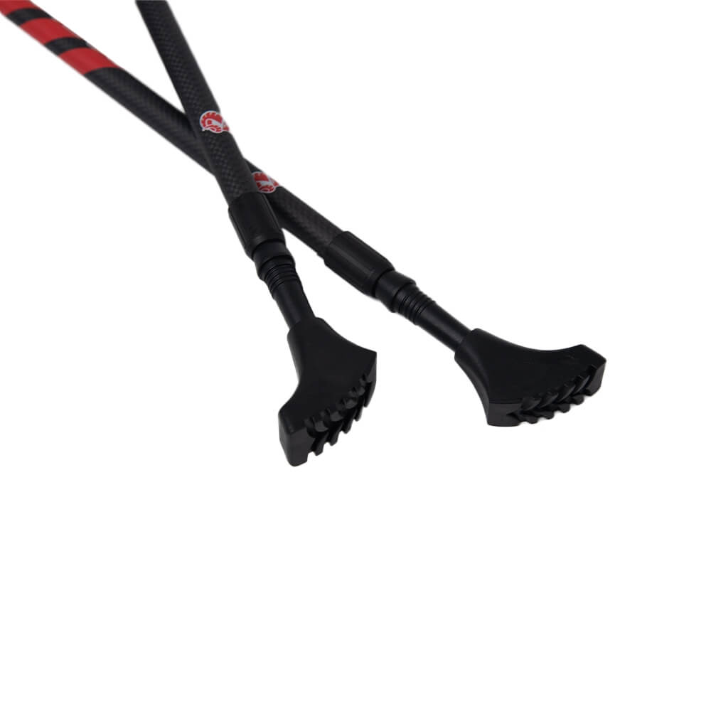 Прочные палки регулируемой длины из карбона. Телескопическая конструкция со специальным зажимом позволяет быстро подогнать палки под рост пользователя. Рукоятки выполнены из пробкового дуба. Противоскользящие грунтозацепы на наконечниках палок не дают им проскальзывать по любому покрытию. Вес палок составляет всего 210 грамм.